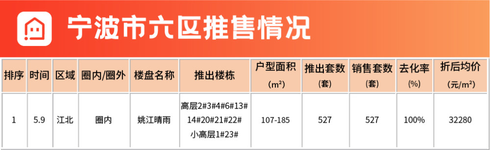 上周僅一個(gè)項(xiàng)目加推,為江北的姚江晴雨。項(xiàng)目位于姚江新城板塊,賣點(diǎn)主要以姚江新城地段及未來規(guī)劃,近軌交4號(hào)線(洪塘中路站),一線臨江,世外學(xué)校教育資源,內(nèi)部商業(yè)配套,價(jià)格倒掛優(yōu)勢為主,去化率100%。