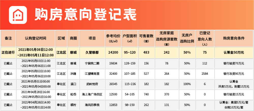 上周,共有6盤確定認(rèn)籌,除去已于前日(5月9日)開盤的姚江晴雨外,本周還將迎來5個(gè)項(xiàng)目入市,但從目前的意向登記人數(shù)來看,堪稱慘淡,其中江北慈城的久譽(yù)慈郡和寧宸院二期都是由圈外晉升到圈內(nèi)的項(xiàng)目,稀缺的房票也讓原先一大批懷抱投資需求的主城區(qū)剛需外溢客戶“有心無力”。