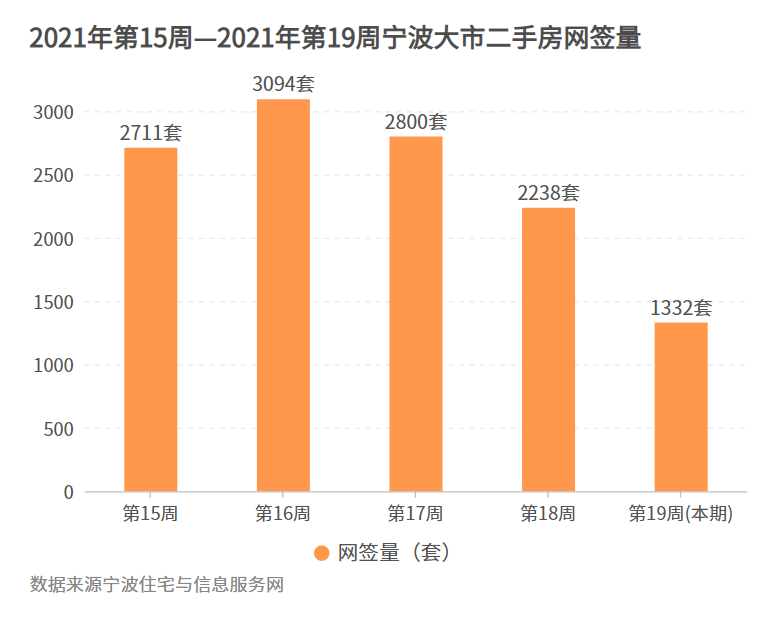 第19周(5.3-5.9),寧波大市共網(wǎng)簽二手房1332套,環(huán)比前一周下跌40.28%。這也是二手房成交量自第17周(新政后)以來第三次下跌,與上上周相比,成交量大幅度回落。其中固然有五一節(jié)日分流的因素,但與去年同時(shí)期相比,成交直接比上年19周同期(2279套)少了41.55%,堪稱腰斬。