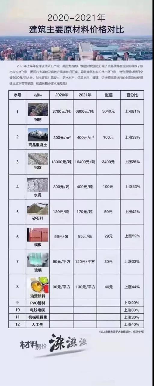 和去年相比,鋼筋上漲了81%,商品混凝土上漲33%,砂石料上漲42%,油漆涂料上漲了44%……就連人工費都上漲了40%!不比不知道,綜合來看,這些建筑材料價格較去年相比基本翻番。建材的價格大幅度上漲確實會產生一些負面影響,但是對房價的影響沒那么大。別忘了那句老話:房地產短期看金融,中期看土地,遠期看人口。和這些因素相比,建筑原材料價格的上漲對房價的影響其實是微乎其微的。但是很重要的一點,伴隨著居高不下的地價,建筑材料的暴漲,會直接壓縮房企的盈利空間。